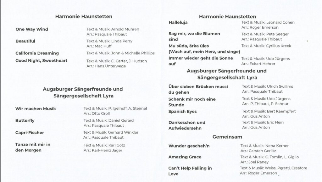 Das diesjährige Konzert war das erste, das die Augsburger Sängerfreunde gemeinsam mit der Sängergesellschaft Lyra aufgeführt haben. Gesungen wurde im großen Saal der Pfarrgemeine Hlgst. Dreifaltigkeit in Augsburg-Kriegshaber. Die Erlöse dieses Benefizkonzerts kamen daher auch der Kirchenmusik dieser Pfarrei zugute.